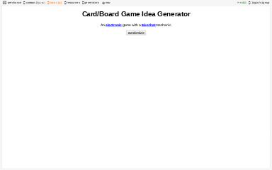 Game idea generator allows you to get a random prompt to help spark new game ideas for video games (maybe even board games) or challenge yourself in some way. Map idea generator stuck for an idea for your next mapping or level design? Generate a taunt or insult for them. Generate ideas for costumes to wear to a christmas party. How do you come up with game ideas? Game idea generator a great game idea could make you a millionaire! This generator can help you come up with a pc, playstation, xbox or nintendo game that could be the next big thing! Generate name suggestions for your cat. Use this generator to create a unique and memorable gaming name to impress other gamers! How to make your own game idea generator? With this, we can have a place for redditors to post ideas they can't utilize themselves, while people who … This generator can help you come up with a pc, playstation, xbox or nintendo game that could be the next big thing! Use this nifty (or terrible) game idea generator.